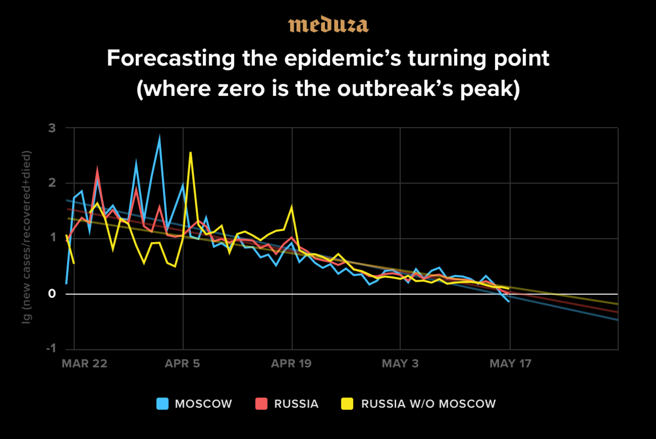 In late April, Meduza reported on forecasts using data-driven models for predicting the course of the COVID-19 epidemic, relying specifically on official state data (which was virtually useless at the start of the outbreak in the absence of other quality indicators and before enough information accumulated). Based on that earlier model, Moscow’s coronavirus outbreak would have peaked in mid-May, while the epidemic nationwide would have peaked around May 20.