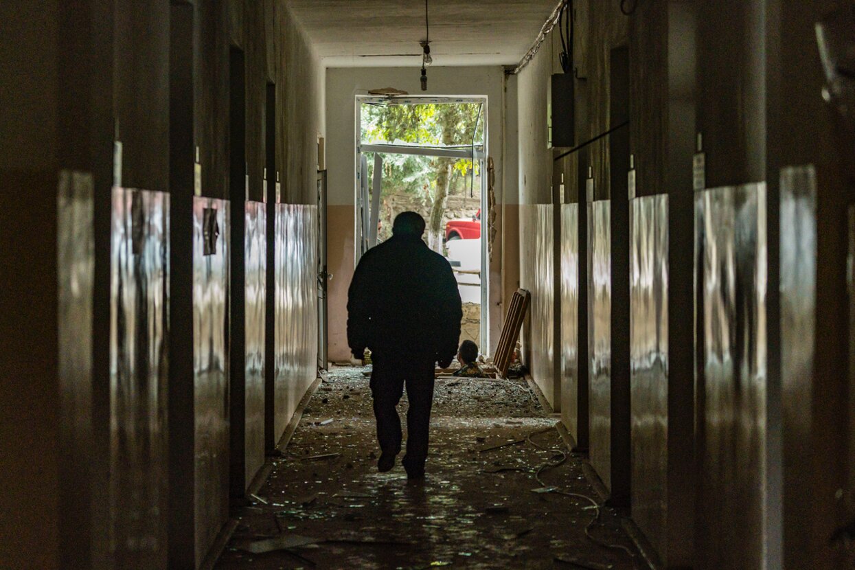 When Elovsky and his colleagues arrived in Martuni, before they came under fire, they saw evidence of the shelling a few days earlier: “destroyed homes, still-lifes covered in sand and building debris, children’s toys, half-eaten fruit lying on tables — everything covered in dust, concrete, bricks, and stones.” Elovsky describes Martuni’s downtown neighborhood as sparsely populated. “It’s also harvesting season now. You can see ripe pomegranates hanging and pumpkins lying on the ground. They need to be gathered, but nobody is doing it,” he told Meduza.