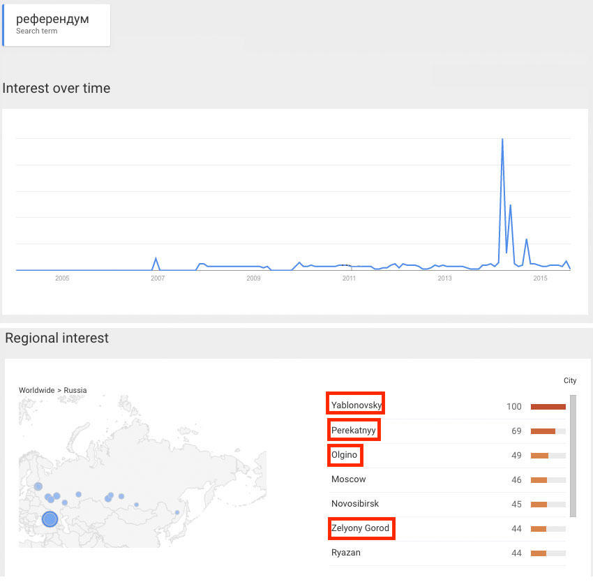 Otakvot says he was able to locate these centers using the service Google Trends, which reveals how often a particular search-term is entered relative to the total search-volume across various regions of the world, and in various languages. By studying searches for various “political” queries (such as the words “Maidan,” “sanctions,” “referendum,” and so on), Otakvot found that, in addition to being common in major cities, these search terms were extremely popular in less populated areas like Olgino (once the home of Russia’s most famous “troll factory,” the Internet Research Agency), Perekatnyy, Yablonovsky, and Zelyony.