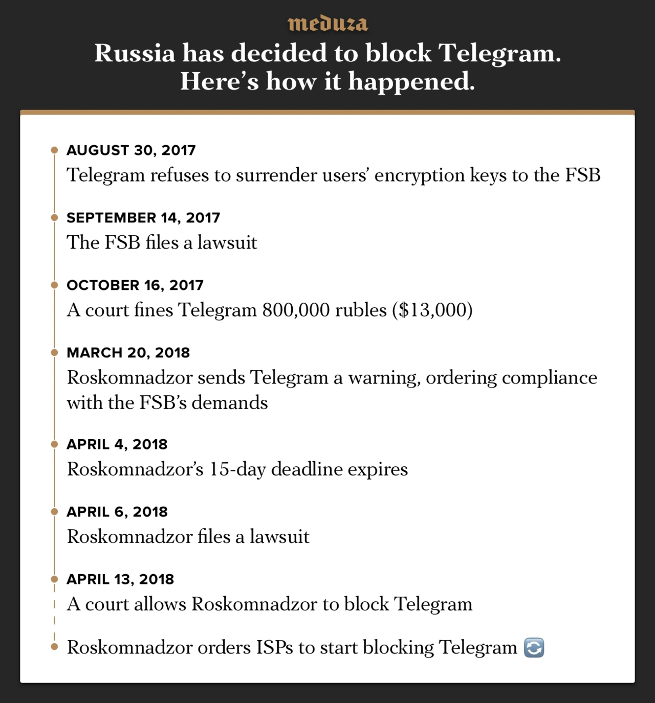 The Federal Security Service has ordered Telegram to surrender the encryption keys for all user correspondence, and the company was already hit with an 800,000-ruble ($13,000) fine for noncompliance. Telegram insists that it is technically incapable of complying because its software architecture doesn’t store these keys centrally (the keys are created and stored on users’ own devices). Russian lawmakers say Telegram must redesign its software, if it’s not currently capable of complying with the country’s new “anti-terrorism” laws.