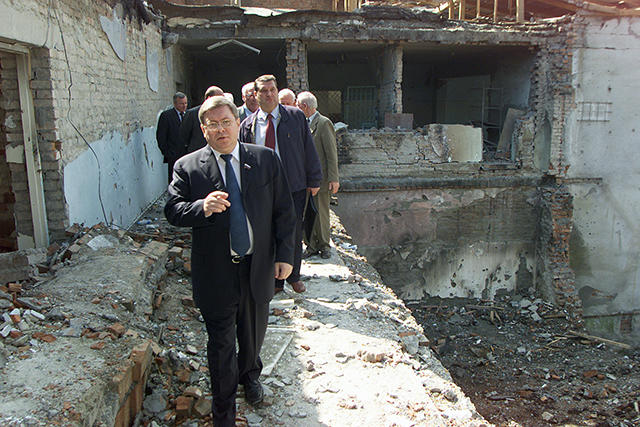 Беслан, 22 сентября 2004 года. Глава парламентской комиссии по расследованию теракта в Беслане Александр Торшин во время осмотра места трагедии.