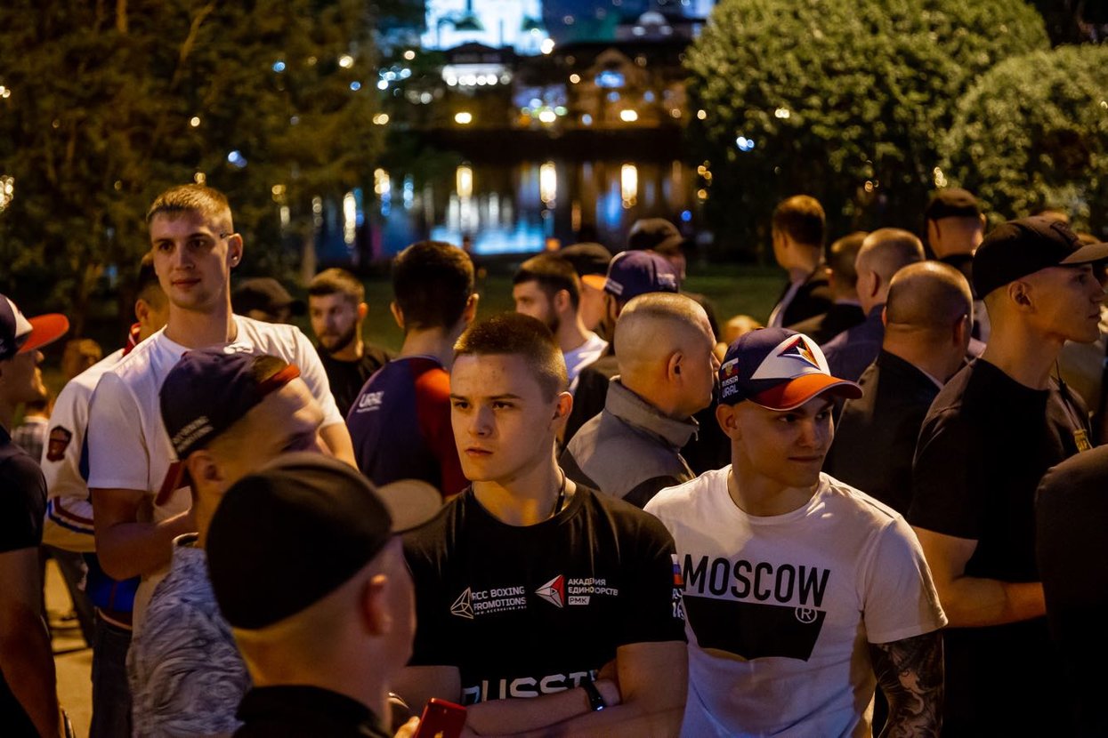 Крепко сложенные молодые люди, некоторые из которых пришли в одежде с официальной символикой «Академии единоборств РМК», прибывали постепенно — но чем больше приходило «спортсменов», тем яснее становилось, что это неоднородная публика. Группы мужчин держались обособленно, разделенные будто на небольшие бригады. Между собой компании почти не взаимодействовали. Всего собралось около ста человек.