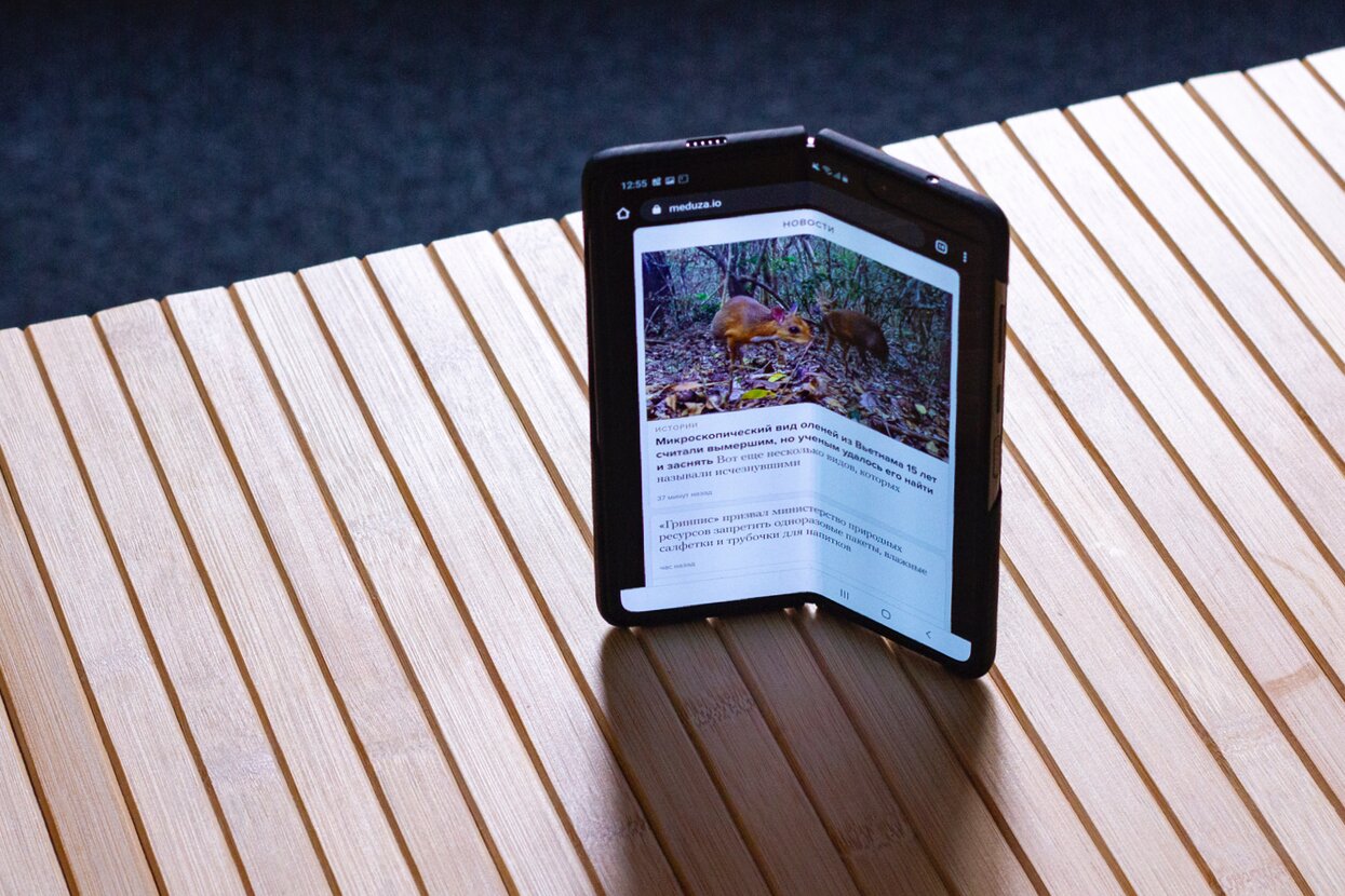 В 2019 году компания Samsung умудрилась дважды выпустить телефон Galaxy Fold с раскладывающимся экраном: первую версию пришлось отозвать до старта продаж из-за технических неполадок. Вторая версия вышла осенью, в России она появилась в конце октября по цене 159 990 рублей. Журналист «Медузы» Султан Сулейманов провел несколько дней с Galaxy Fold и рассказывает, можно ли считать его устройством будущего.