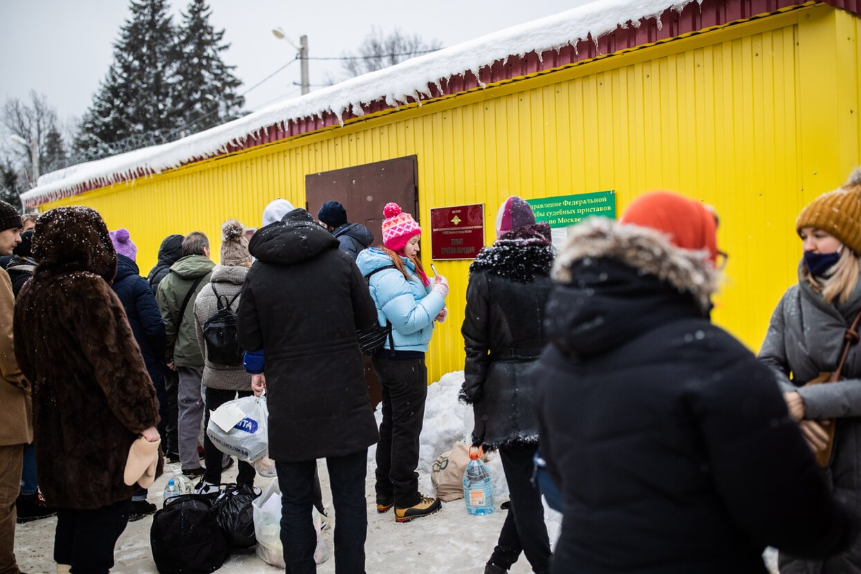 «Изолятор не готов принимать столько людей. Они работают с 11 утра и к половине пятого приняли только 19 передач, — рассказывает волонтер Марина, закутанная в теплый платок оранжевого цвета. — Наученные горьким опытом люди начинают приезжать сюда уже в семь утра».