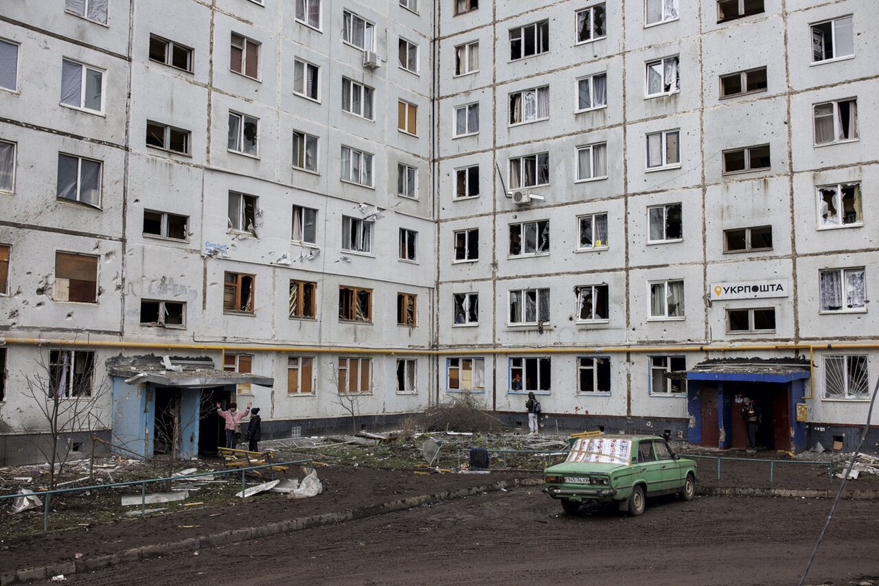 Местные жители во дворе пострадавшего от артиллерийских атак жилого дома в Харькове.