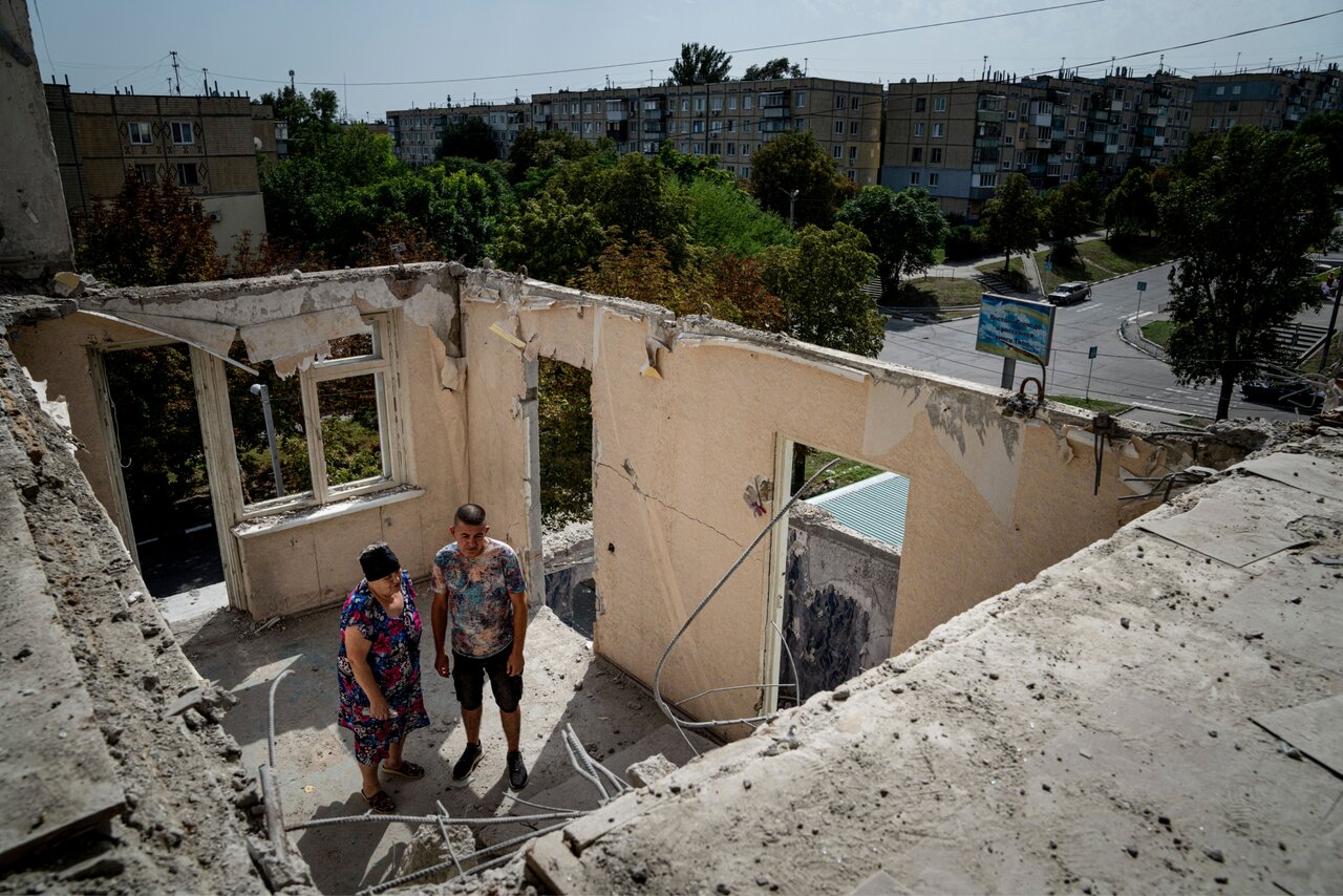Жители Никополя Днепропетровской области в своей квартире, разрушенной российской бомбардировкой. В ночь на 22 августа по городу выпустили 42 снаряда из РСЗО и ствольной артиллерии. Четыре человека были ранены. В результате атаки выведена из строя ЛЭП, до двух тысяч человек остались без света