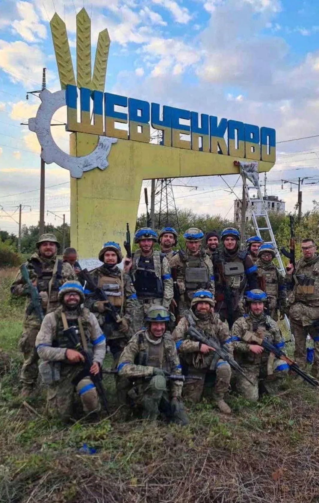 Украинские военные позируют на фоне стелы с названием поселка Шевченково, который перешел под контроль ВСУ наряду с Балаклеей в Харьковской области. Шевченково находится примерно в 80 километрах от Харькова