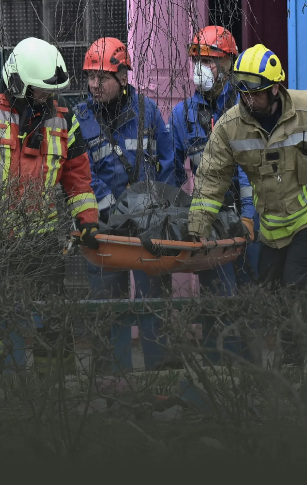 Спасатели выносят тело погибшего из одного из зданий Ржищева, разрушенного российской ракетой