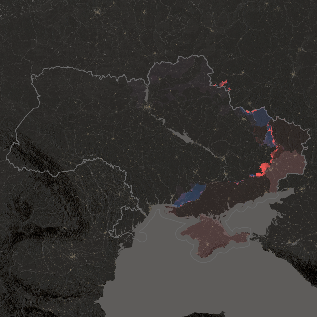 Поскольку качественных данных о контроле территорий в Донбассе, где активные боевые действия велись в 2014–2015 годах, и в Крыму, по-видимому, нет, на графике приведены всего два статичных состояния: