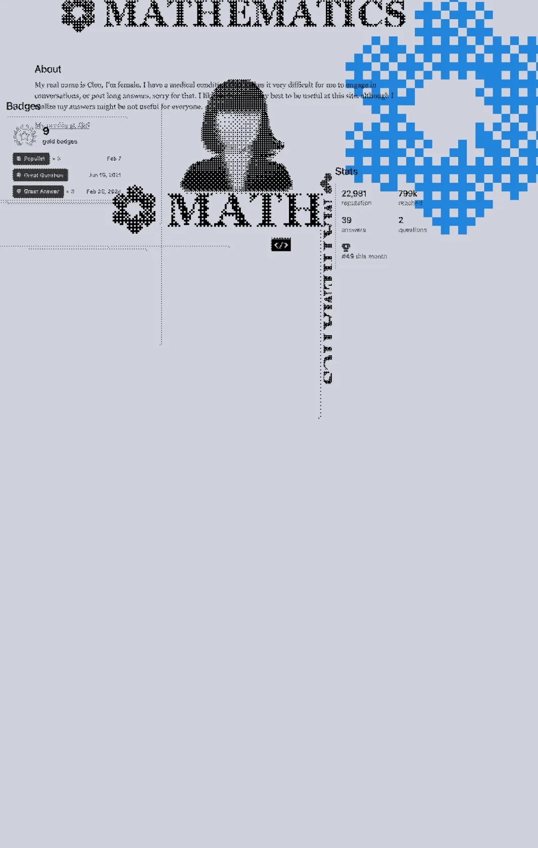 Мое настоящее имя Клео, я женщина. У меня есть заболевание, из-за которого мне очень сложно участвовать в обсуждениях или публиковать длинные ответы, извините меня за это. Я люблю математику и прикладываю все усилия, чтобы быть полезной на этом сайте, хотя я понимаю, что мои ответы могут быть полезны не всем.