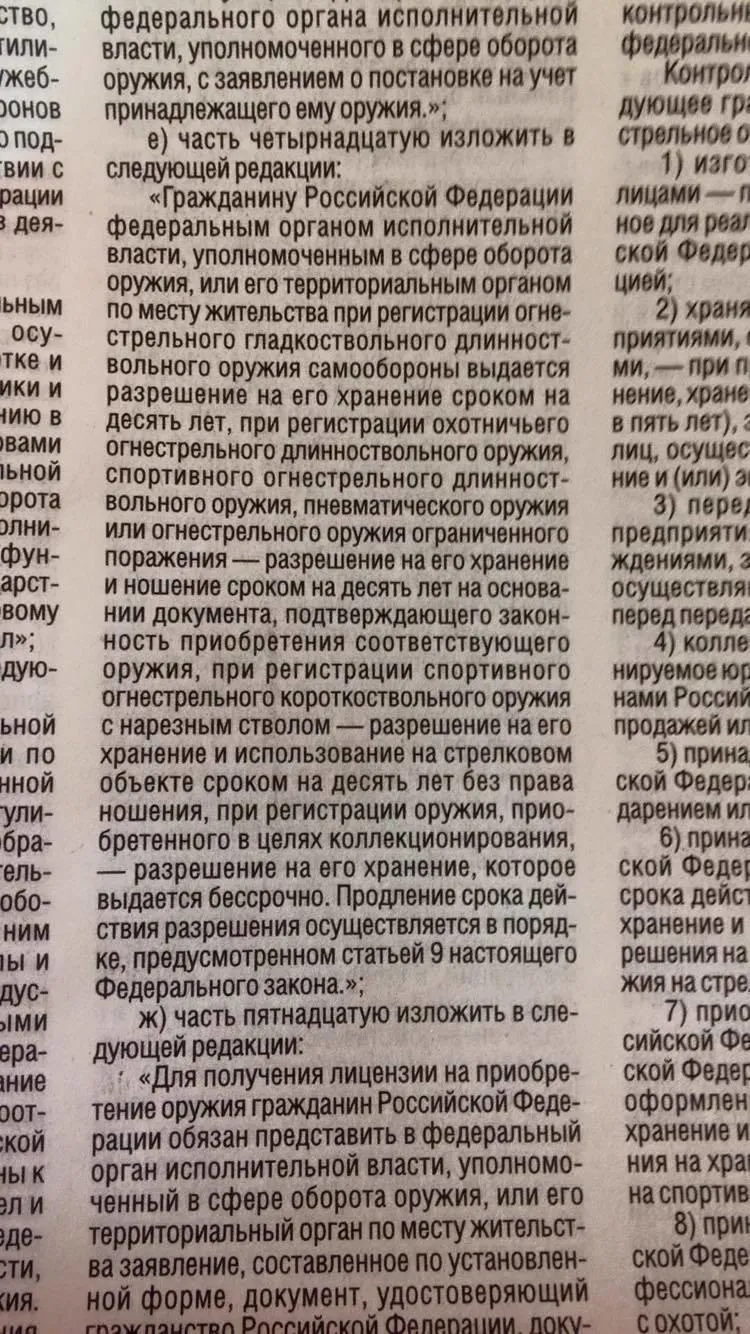 «Российская газета» опубликовала два варианта одного и того же закона об оружии. В документе на сайте издания указано, что срок действия разрешения на хранение гражданского оружия составляет пять лет. В тексте закона, опубликованном в бумажной версии газеты, этот срок составляет 10 лет.