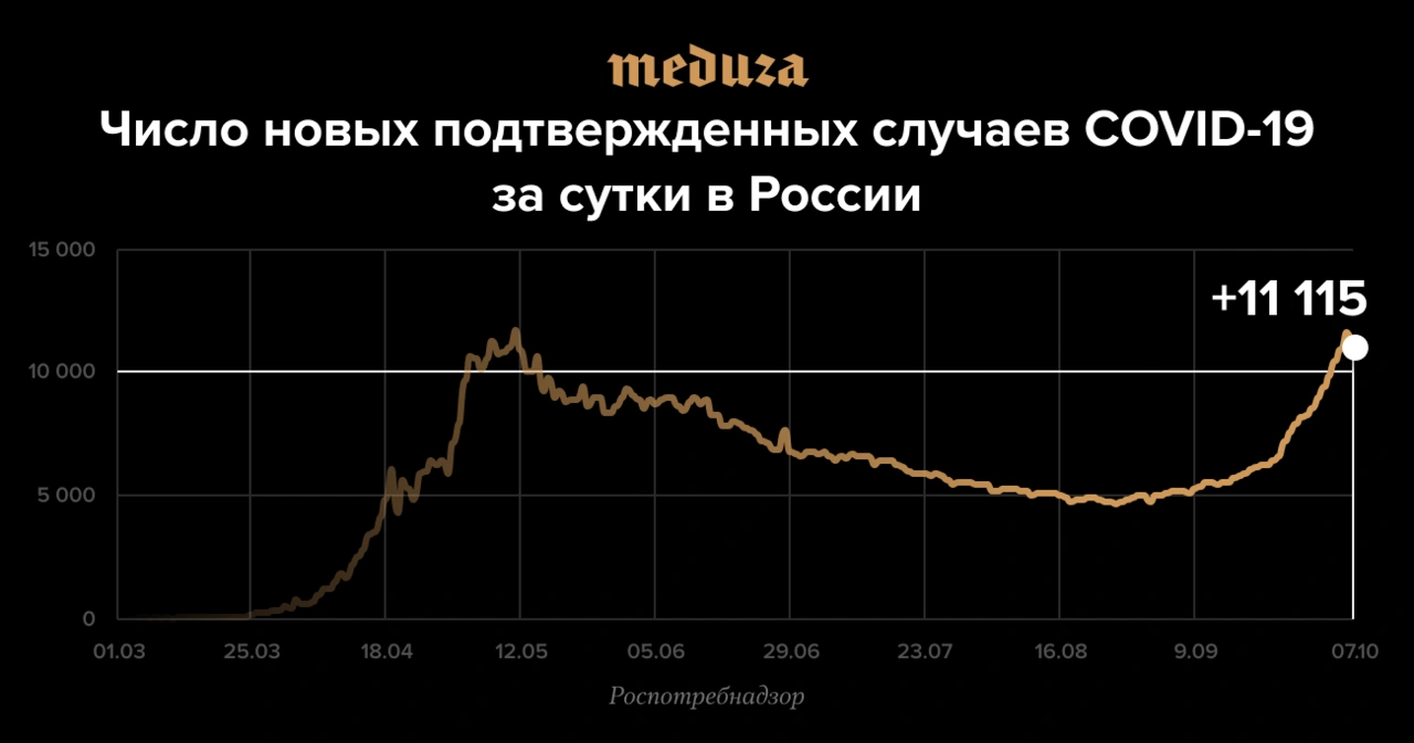В России за прошедшие сутки выявлено 11 115 новых случаев заболевания коронавирусной инфекцией. Днем ранее, 6 октября, COVID-19 обнаружили у 11 615 человек, что стало вторым рекордным суточным приростом с начала пандемии. Самое большое число заболевших было 11 мая — 11 656 новых случаев.