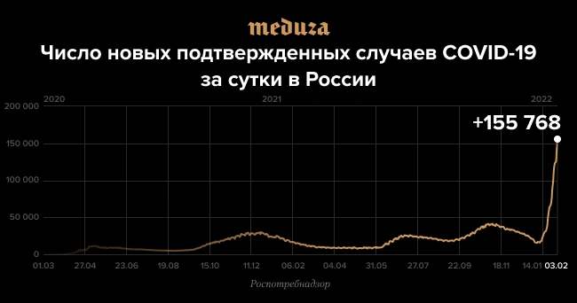 За прошедшие сутки в России выявлено 155 768 новых случаев коронавирусной инфекции, сообщил федеральный оперативный штаб по борьбе с COVID-19. Суточная заболеваемость ковидом в России обновляет рекорды уже почти две недели.