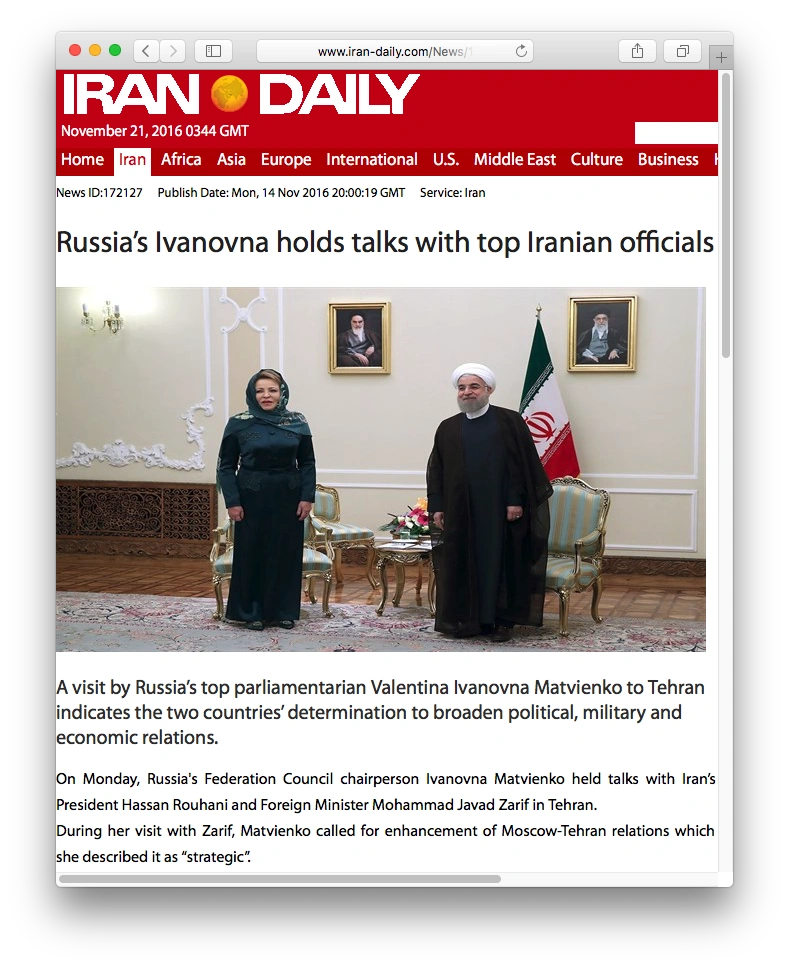 Иранская англоязычная газета Iran Daily написала о встрече председателя Совета Федерации Валентины Матвиенко с президентом Ирана Хасаном Роухани. Правда, издание не разобралось, где в строчке «Валентина Ивановна Матвиенко» имя, поэтому называло ее то «Ивановна», то «Ивановна Матвиенко».
