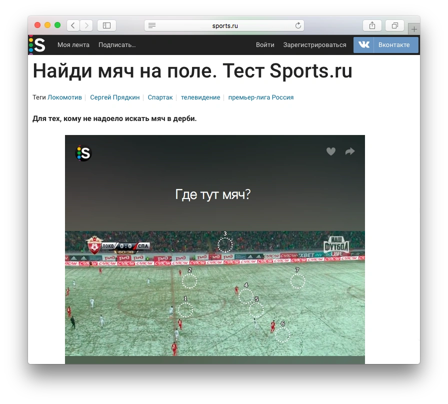 Издание Sports.ru выпустило мини-игру «Найди мяч на поле», посвященную футбольному матчу «Спартак» — «Локомотив». В ней нужно обнаружить мяч на скриншоте трансляции матча.