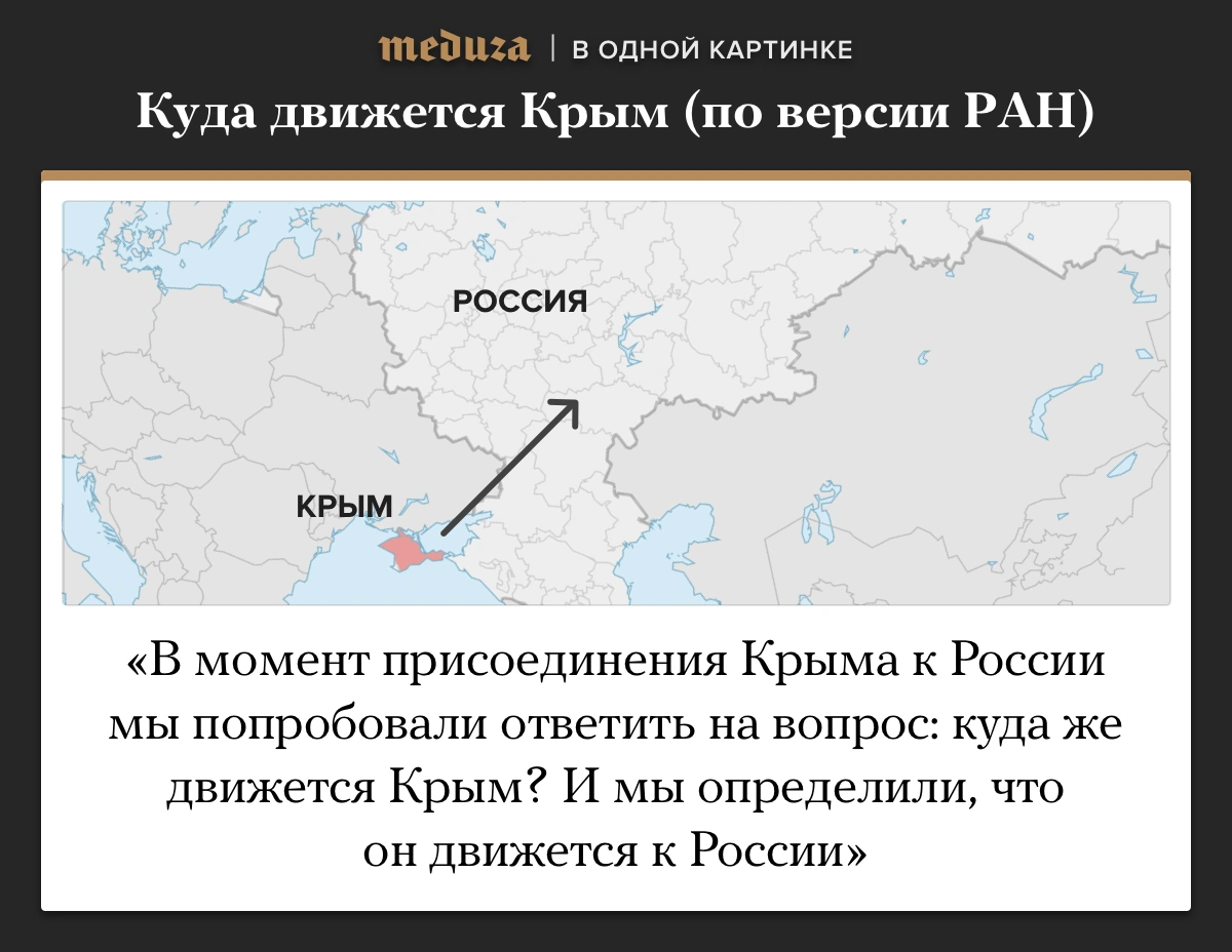 Институт прикладной астрономии РАН 4 октября объявил, что тектоническое движение Крыма направлено к России: так что в момент присоединения полуострова, по данным исследователей, Крым и сам двигался в сторону РФ.