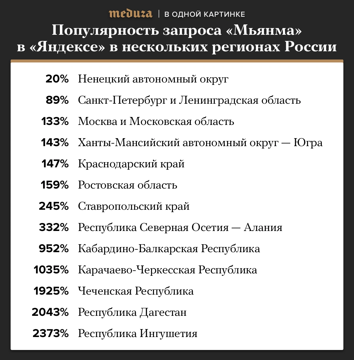 Для подсчета использовалась методология «Региональной популярности» — доли, которую регион занимает в показах по конкретному слову, поделенной на количество всех показов поиска, пришедшихся на регион за месяц. Популярность слова в 100% значит, что слово в регионе ничем не выделено, меньше — что к нему пониженный интерес, больше — что повышенный. По абсолютному количеству запросов в лидерах с большим отрывом окажутся Москва и Московская область (в методологии «Яндекса» это один регион).