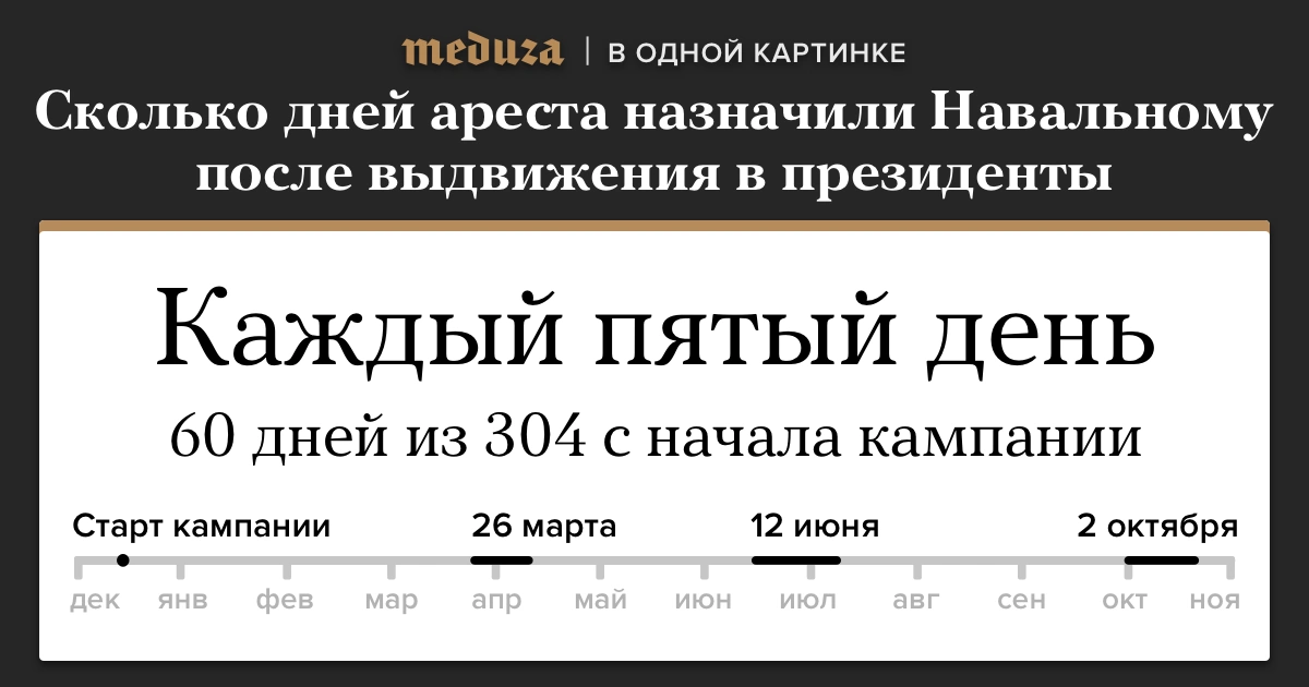 2 октября Симоновский суд Москвы арестовал Алексея Навального на 20 суток за повторное нарушение порядка проведения митинга. Это уже третий арест политика с того момента, как он объявил о выдвижении в президенты в декабре 2016 года и начал проводить массовые акции. В общей сложности Навальный за неполный год проведет под арестом 60 дней.