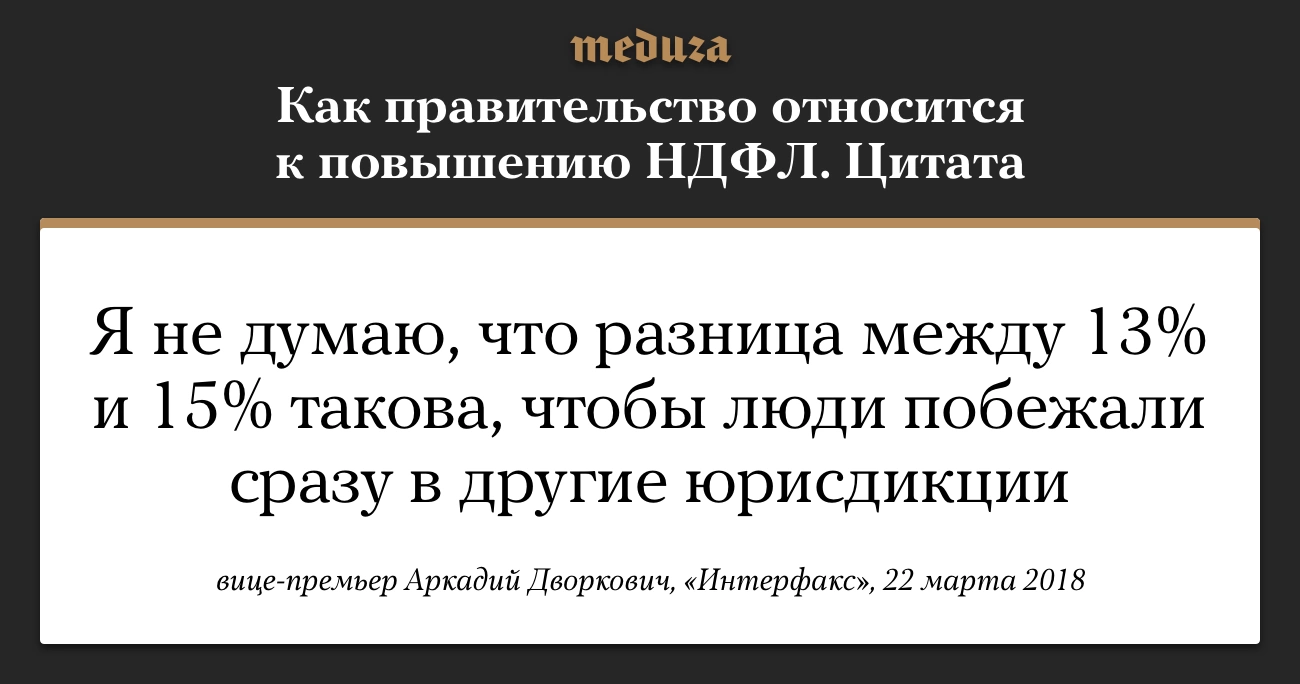 После президентских выборов правительство вернулось к обсуждению налоговой реформы. В частности, предлагается повысить ставку налога на доходы физических лиц с 13% до 15%. Это должно помочь реализовать шестилетний план по повышению показателей жизни, которые президент Владимир Путин озвучил в послании Федеральному собранию. В первой версии этой картинки была дана цитата Аркадия Дворковича с ленты «Интерфакса», затем агентство уточнило ее. Картинка была обновлена.