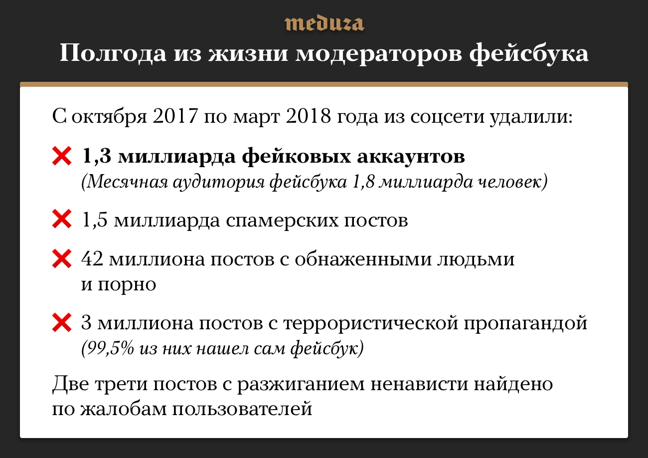 Компания Facebook 15 мая впервые отчиталась о борьбе с нежелательным контентом. В отчет вошли данные за последний квартал 2017 года и первый квартал 2018-го: соцсеть рассказала о сотнях миллионов фейковых аккаунтов, удаленных за это время (они составляют 3-4% от месячной аудитории сервиса), а также о десятках миллионов постов, фотографий и видео, нарушающих правила сайта. Чаще всего, утверждает Facebook, посты удаляются автоматически — еще до того, как на них успел кто-нибудь пожаловаться. Исключение — записи, разжигающие ненависть, где около 60-70% постов были удалены после жалоб пользователей.