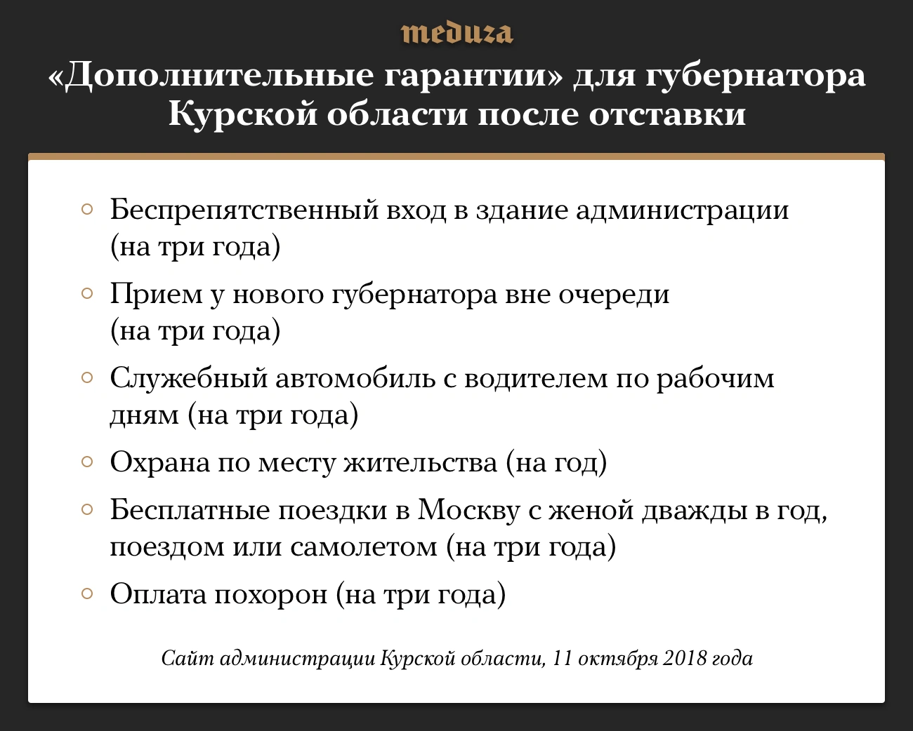 Губернатор Александр Михайлов подписал постановление «О дополнительных гарантиях губернатора Курской области в связи с прекращением полномочий» 10 октября — а на следующий день ушел в отставку. В документе перечислены условия предоставления гарантий, которым соответствует только Михайлов, в том числе пребывание на должности два срока подряд или более (его предшественники руководили регионом по одному сроку).