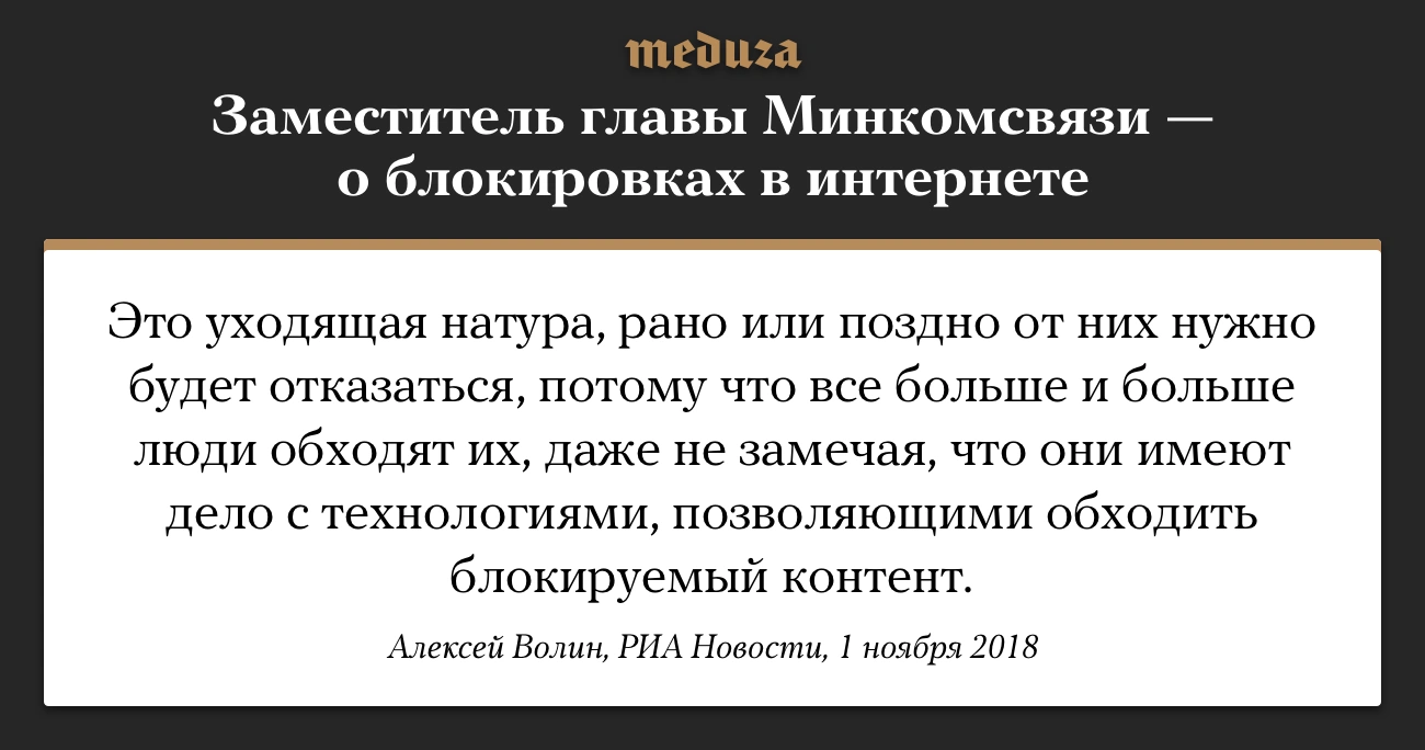 Заместитель главы Минкомсвязи Алексей Волин заявил, что блокировки в интернете все более неэффективны. Любую блокировку, указал Волин, можно обойти. В пример он привел Китай, «где работают и Telegram, и WhatsApp, которые официально заблокированы». Волин ранее уже указывал, что полностью что-либо заблокировать в интернете «в принципе, невозможно».