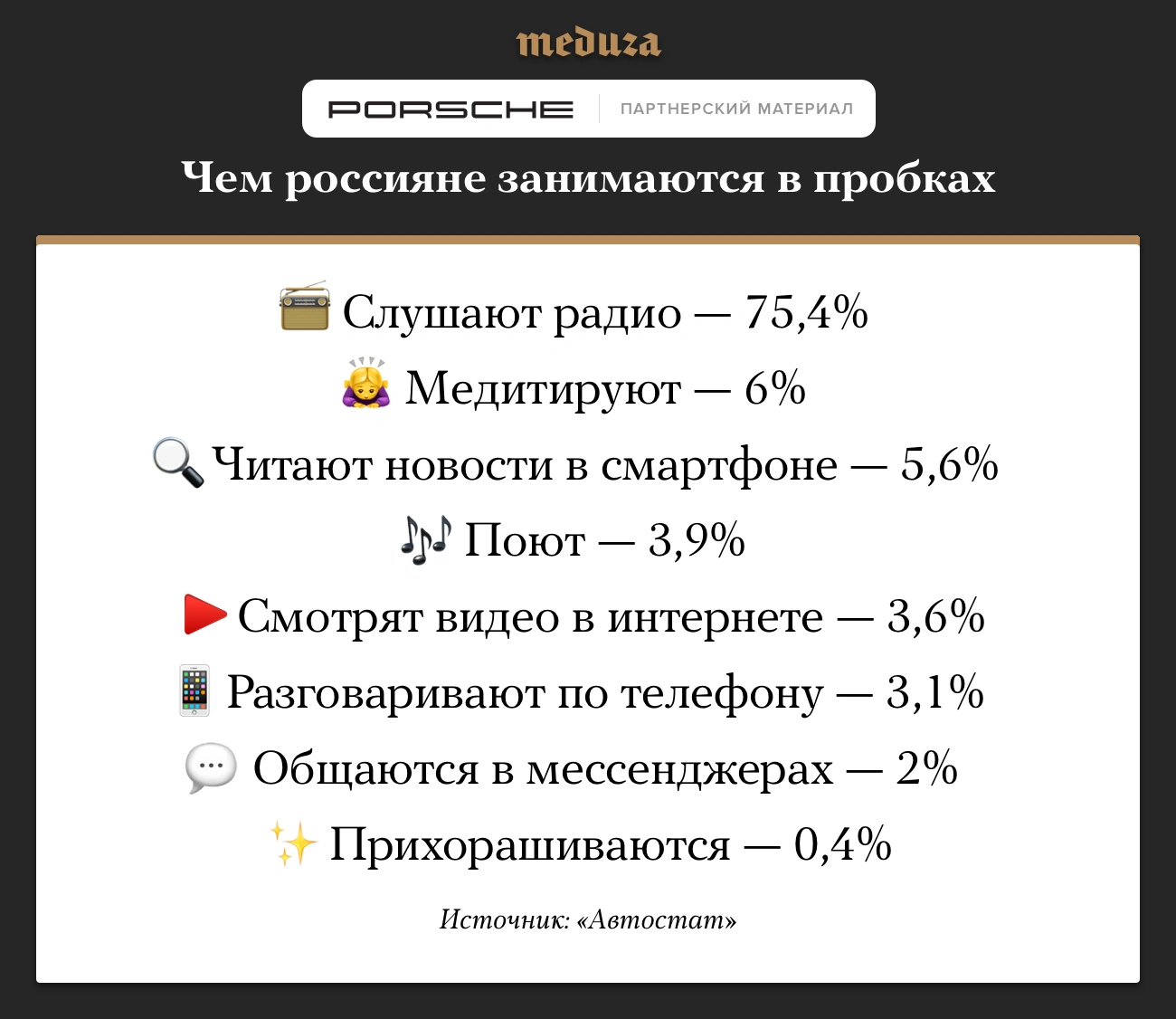 Если вы хозяин автомобиля Porsche или собираетесь им стать, то скучать в пробке не придется. У Porsche есть платформа Porsche Connect, которая подключается к интернету и объединяет телефон и автомобиль в единую систему. Подробности о ней можно прочитать здесь. Если вкратце: с Porsche Connect можно не только прокладывать маршруты, искать бесплатные парковки, обновлять карты, но и слушать последние новости с любимых сайтов (например, «Медузы»), узнавать прогноз погоды или звонить близким, не отвлекаясь на телефон. Чтобы активировать эту услугу, наберите в телефоне код *718 и запросите на имейл письмо с приглашением. По ссылке из письма вы попадете на форму регистрации, где нужно заполнить анкету и подтвердить все условия. После этого вы сможете зайти в раздел Connect Store, установить Porsche Connect и пользоваться им бесплатно в течение двух лет.