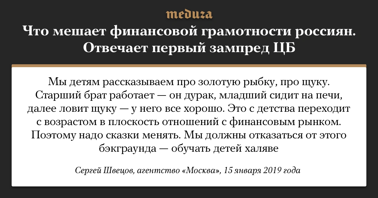 Первый заместитель председателя Центробанка Сергей Швецов призвал к повышению финансовой грамотности населения. По его мнению, россияне «все равно делают неправильные вещи» из-за русских сказок, которые они читают в детстве.