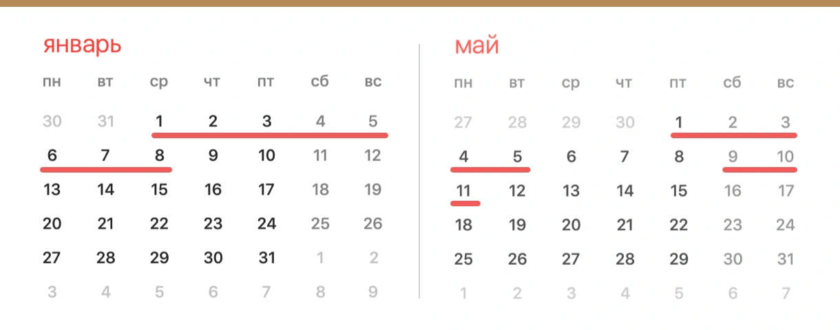 Правительство России утвердило постановление о переносе выходных и праздничных дней в 2020 году. Выходные 4 и 5 января, совпадающие с нерабочими праздничными днями, перенесли на 4 и 5 мая. Таким образом, в Новый год будет восемь выходных, а весной выходными будут 1 — 5 мая и 9 — 11 мая.