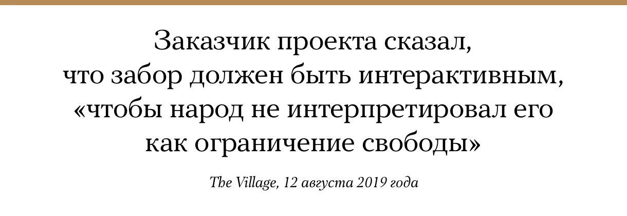 Издание The Village показало рендеры забора, который планируется установить вокруг общественного пространства «Яма» на Хохловской площади в Москве. В последние месяцы в «Яме» неоднократно задерживали людей; кроме того, там предположительно действовал серийный отравитель. О том, что общественное пространство могут обнести забором, 9 августа сообщил муниципальный депутат Виктор Котов со ссылкой на ответ прокуратуры Басманного района Москвы. Источник The Village из департамента культуры московского правительства утверждает, что ограждение вокруг «Ямы» может появиться уже ко Дню города, который в Москве будут отмечать 7 и 8 сентября. Согласно техзаданию, забор будет иметь минимум три метра в высоту. При этом формально его разрабатывают как «мобильную декоративную конструкцию» с тремя вариантами оформления: с баннерами ко Дню города, в стиле «стимпанк» и в виде «фитостены». «Заказчик проекта сказал, что забор должен быть интерактивным, „чтобы народ не интерпретировал его как ограничение свободы“», — рассказал источник The Village.