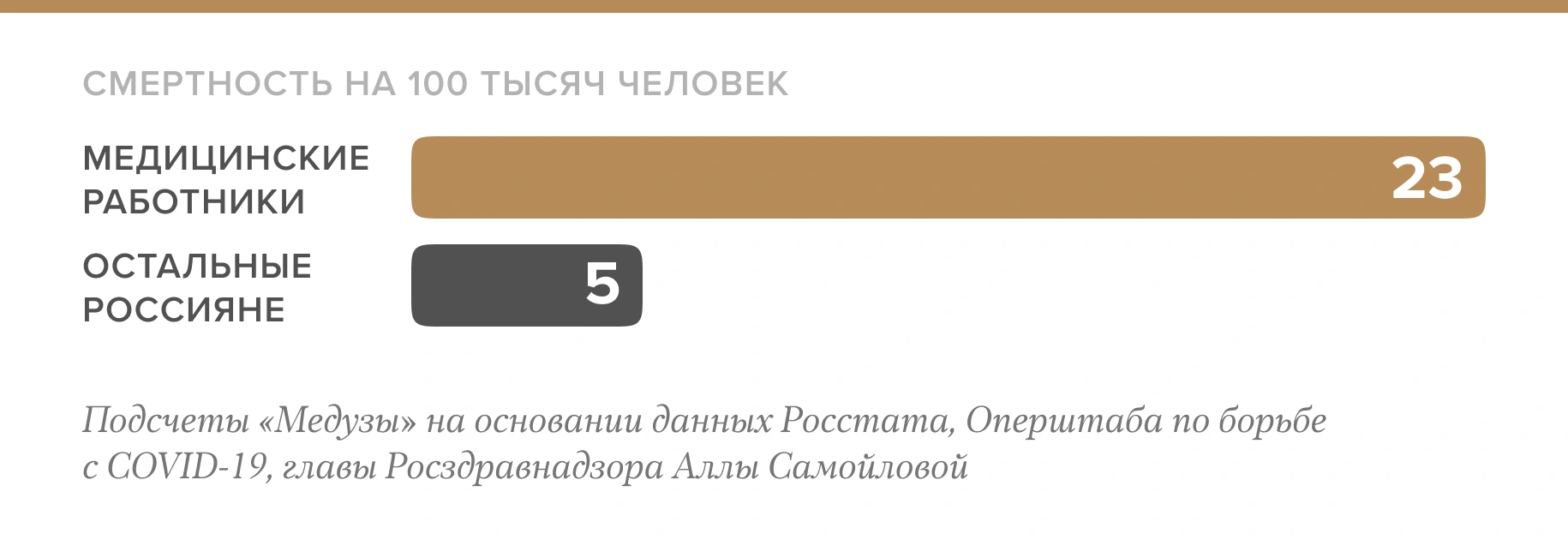 Глава Росздравнадзора Алла Самойлова заявила, что с начала эпидемии ковида в России от болезни умерли 489 медицинских работников (позже пресс-служба ведомства заявила, что цифры, о которых она говорила — неофициальные). В 147-миллионной России, по данным Росстата, в 2019 году было 2,14 миллиона медицинских работников (в это число входят врачи, средний и младший медицинский и фармацевтический персонал). При общем количестве в 7660 смертей от коронавируса в России это означает, что медики умирают от болезни почти в пять раз чаще, чем остальные жители РФ. При этом в конце мая — спустя более двух месяцев после начала эпидемии — глава Роспотребнадзора Анна Попова утверждала, что смертность среди медработников не выше, чем в среднем по стране.