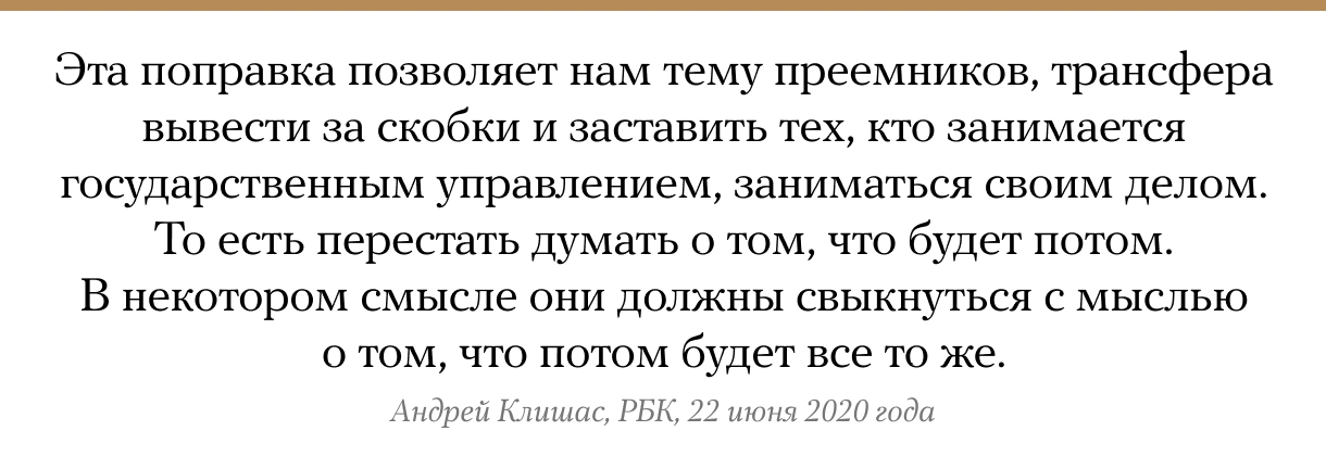 Сенатор Андрей Клишас, возглавляющий рабочую группу по разработке поправок в Конституцию РФ, объяснил в интервью РБК смысл так называемой «поправки Терешковой», обнуляющей президентские сроки Владимира Путина. По его словам, это изменение в основной закон страны «нужно для того, чтобы никто не обнулил последние 20 лет нашей истории». Она также необходима, чтобы чиновники закрыли тему преемника и перестали беспокоиться о будущем, заявил Клишас. Накануне в документальном фильме телеканала «Россия 1» сам Владимир Путин высказал похожую мысль, заявив, что «если поправки не будет, то вместо нормальной ритмичной работы на очень многих уровнях власти начнется рысканье глазами в поисках возможных преемников». «Работать надо, а не преемников искать», — подытожил президент. Путин не исключил, что будет снова баллотироваться на пост главы государства в случае принятия поправки Терешковой.