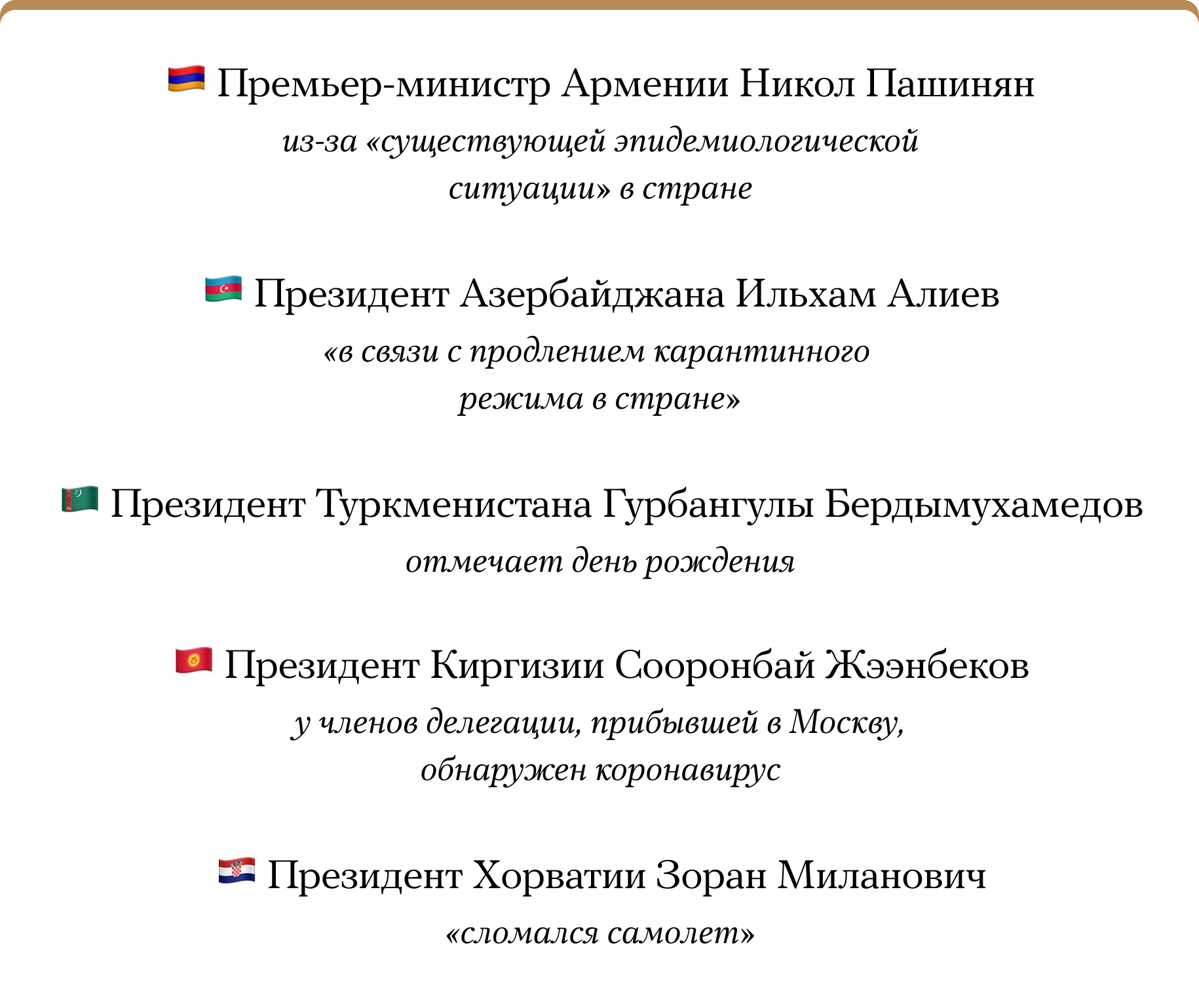 Пять лидеров стран, приглашенных на парад Победы в Москве, не смогли посетить его по разным причинам. Премьер Армении и президент Азербайджана не поехали из-за пандемии коронавируса. Глава Туркменистана отказался ехать, чтобы по возвращении не отмечать свой день рождения на самоизоляции. Президент Хорватии не поехал в Москву из-за поломки самолета. А президент Киргизии приехал, но не смог пойти на парад из-за коронавируса у членов его делегации.