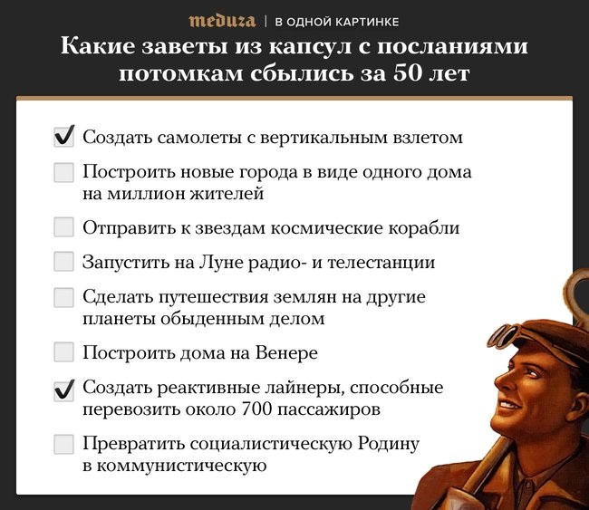 В России к 100-летию революции начали вскрывать капсулы с посланиями, оставленными 50 лет назад гражданами СССР. Как выясняется, потомки не оправдали их ожиданий — не построили городов на Венере, а космические корабли все еще не летят к звездам.