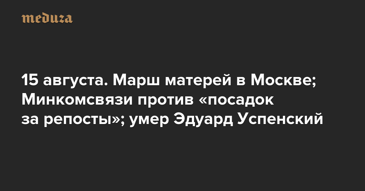 Вечерняя Медуза 15 августа. Марш матерей в Москве; Минкомсвязи против «посадок за репосты»; умер Эдуард Успенский