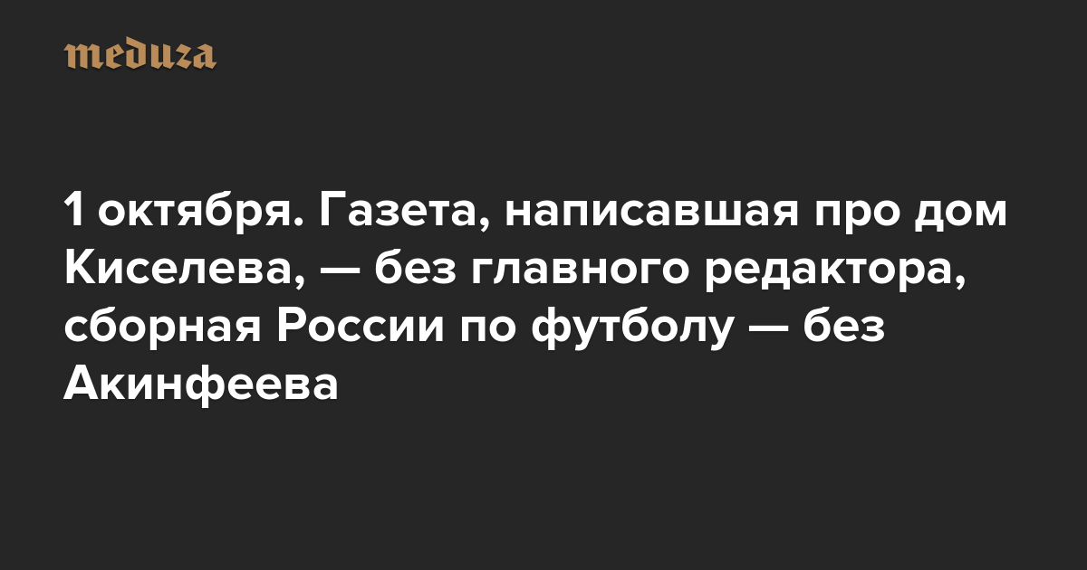 Вечерняя Медуза 1 октября. Газета, написавшая про дом Киселева, — без главного редактора, сборная России по футболу — без Акинфеева