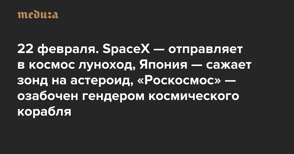 Вечерняя Медуза 22 февраля. SpaceX — отправляет в космос луноход, Япония — сажает зонд на астероид, «Роскосмос» — озабочен гендером космического корабля