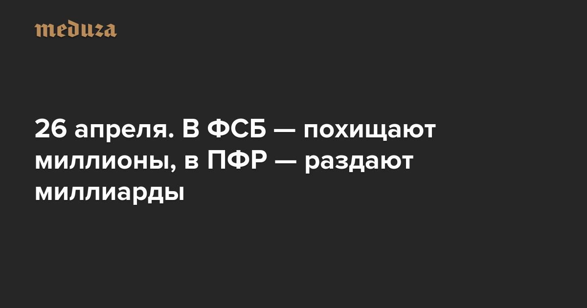 Вечерняя Медуза 26 апреля. В ФСБ — похищают миллионы, в ПФР — раздают миллиарды