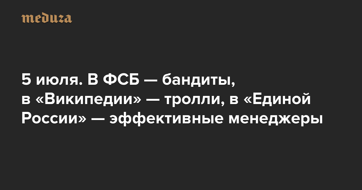 Вечерняя Медуза 5 июля. В ФСБ — бандиты, в «Википедии» — тролли, в «Единой России» — эффективные менеджеры