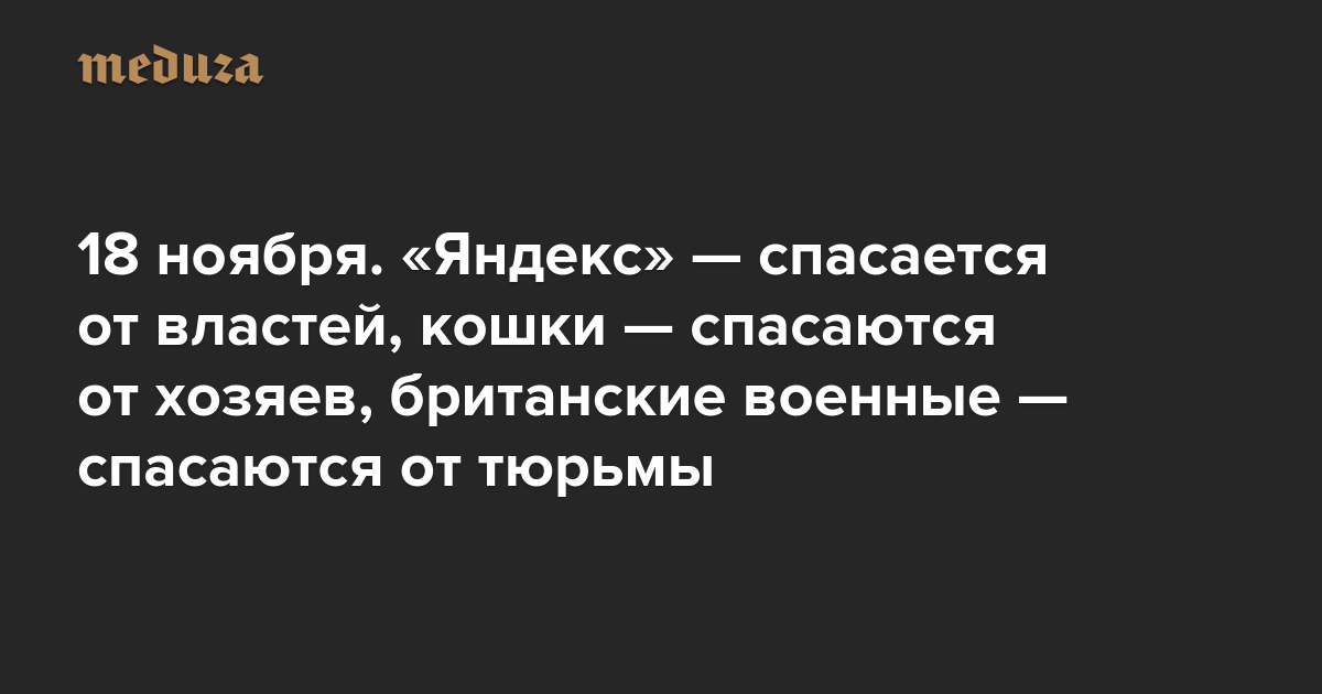Вечерняя Медуза 18 ноября. «Яндекс» — спасается от властей, кошки — спасаются от хозяев, британские военные — спасаются от тюрьмы