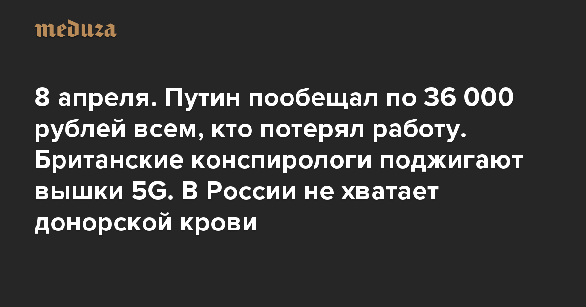 Вечерний Коронавирус 8 апреля. Путин пообещал по 36 000 рублей всем, кто потерял работу. Британские конспирологи поджигают вышки 5G. В России не хватает донорской крови