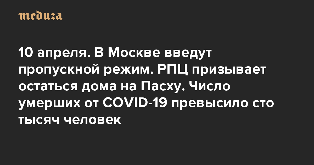 Вечерний коронавирус 10 апреля. В Москве введут пропускной режим. РПЦ призывает остаться дома на Пасху. Число умерших от COVID-19 превысило сто тысяч человек