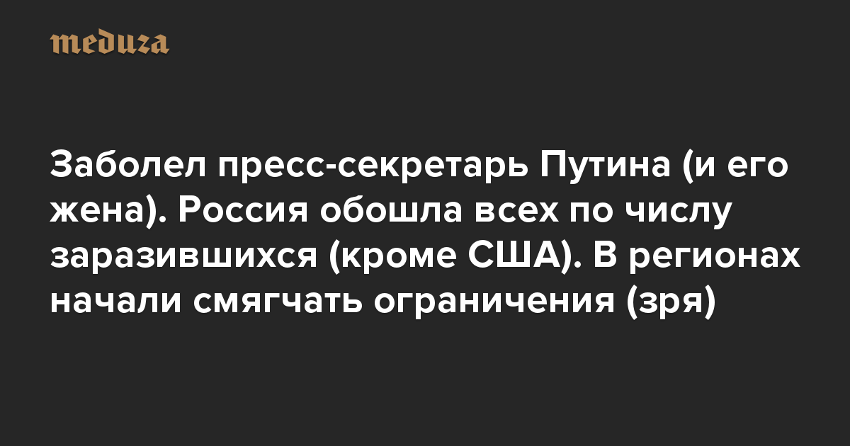 Вечерний Коронавирус Заболел пресс-секретарь Путина (и его жена). Россия обошла всех по числу заразившихся (кроме США). В регионах начали смягчать ограничения (зря)