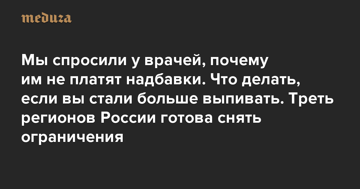 Вечерний Коронавирус Мы спросили у врачей, почему им не платят надбавки. Что делать, если вы стали больше выпивать. Треть регионов России готова снять ограничения