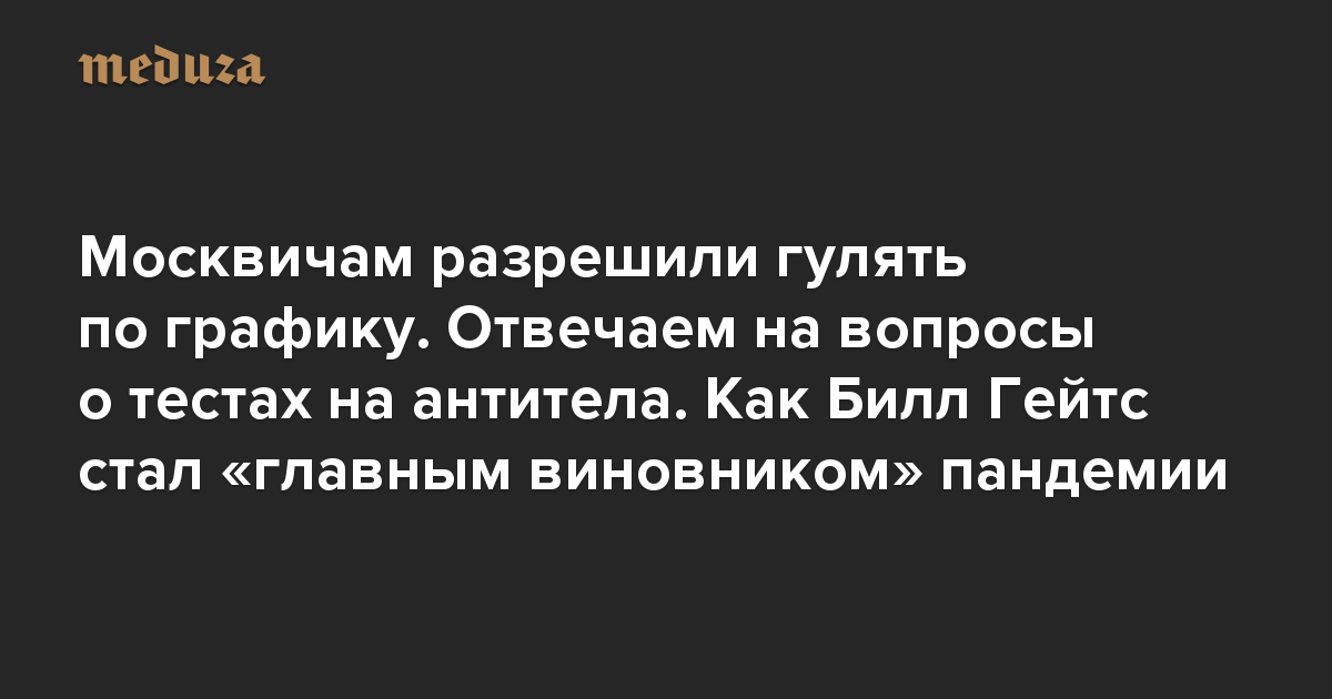 Вечерний Коронавирус Москвичам разрешили гулять по графику. Отвечаем на вопросы о тестах на антитела. Как Билл Гейтс стал «главным виновником» пандемии