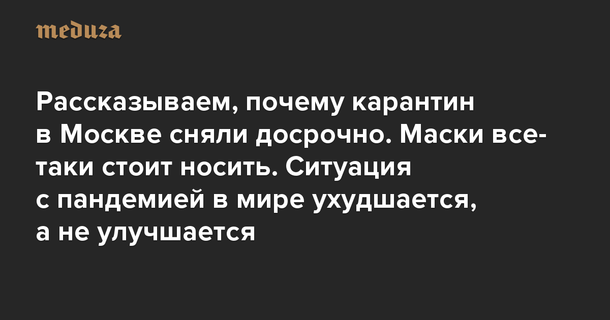 Вечерний Коронавирус Рассказываем, почему карантин в Москве сняли досрочно. Маски все-таки стоит носить. Ситуация с пандемией в мире ухудшается, а не улучшается