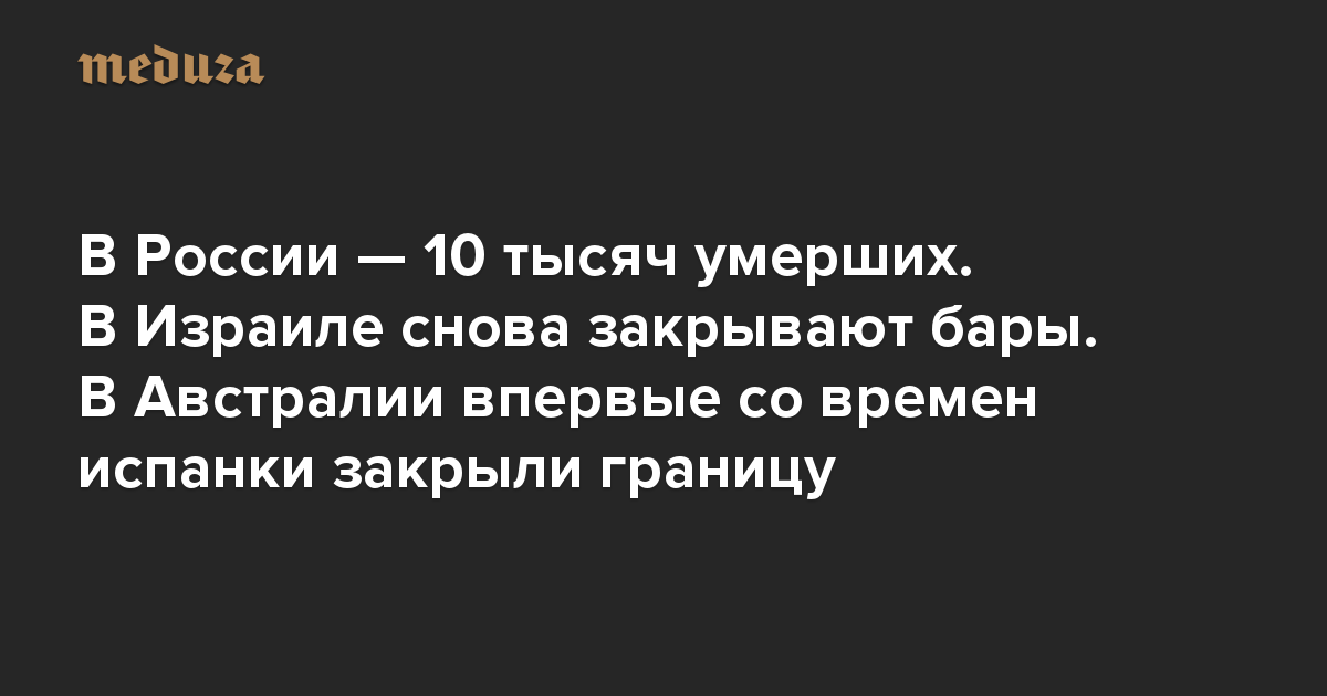 Вечерний коронавирус В России — 10 тысяч умерших. В Израиле снова закрывают бары. В Австралии впервые со времен испанки закрыли границу