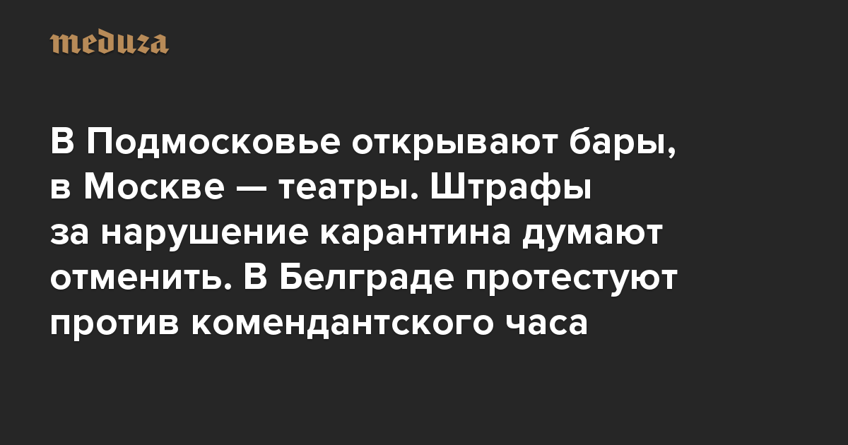 Вечерний Коронавирус В Подмосковье открывают бары, в Москве — театры. Штрафы за нарушение карантина думают отменить. В Белграде протестуют против комендантского часа