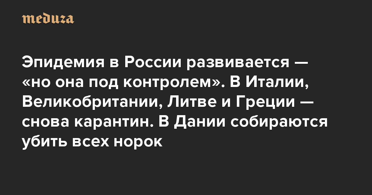 Вечерний Коронавирус Эпидемия в России развивается — «но она под контролем». В Италии, Великобритании, Литве и Греции — снова карантин. В Дании собираются убить всех норок