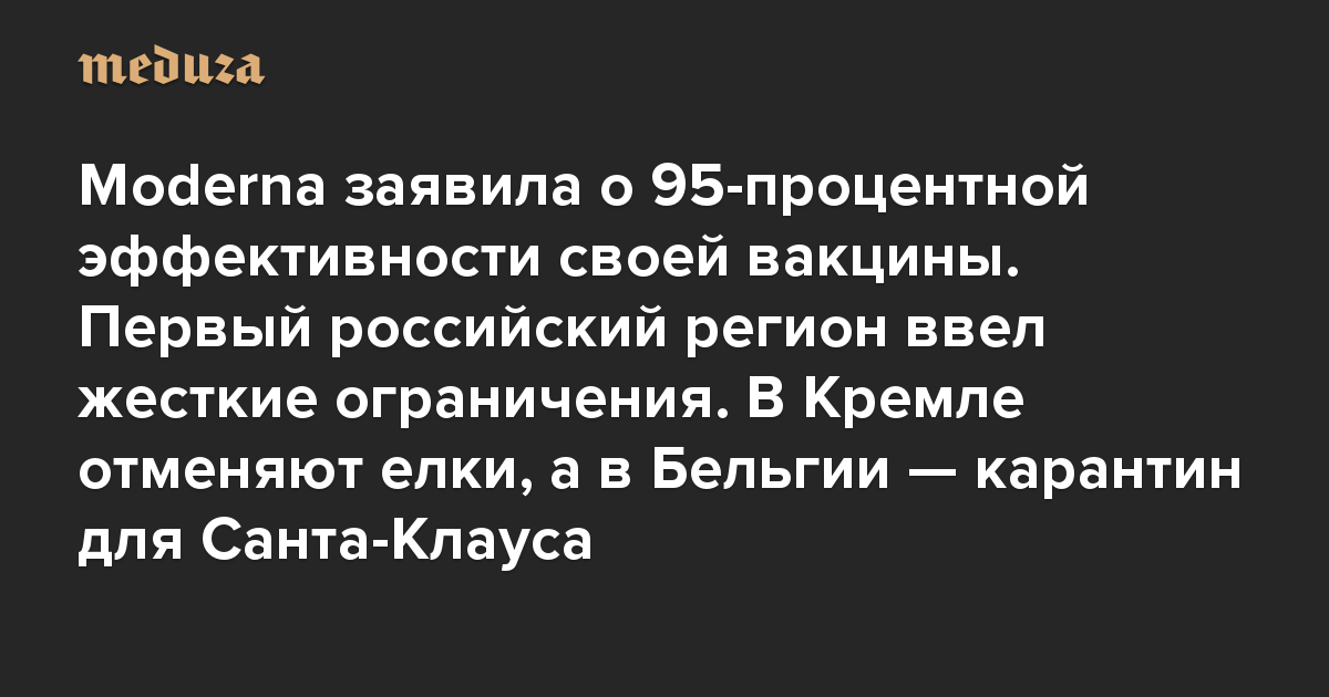 Вечерний Коронавирус Moderna заявила о 95-процентной эффективности своей вакцины. Первый российский регион ввел жесткие ограничения. В Кремле отменяют елки, а в Бельгии — карантин для Санта-Клауса